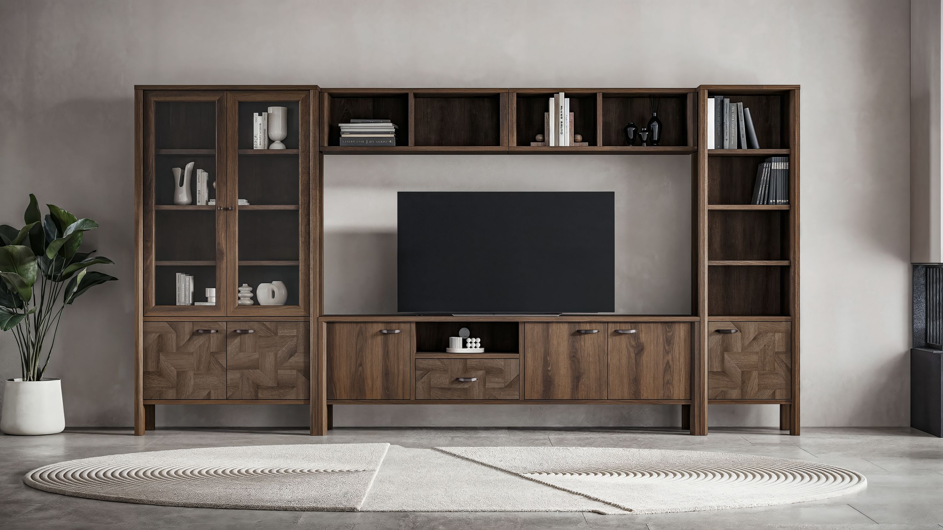 TV ünitesi, iki farklı alt modül seçeneğiyle kullanıcıya modüler bir kurulum kolaylığı ve farklı yaşam alanlarına kolayca uyum imkanı sunuyor. Camlı, geniş ve dar olmak üzere alternatif kitaplık seçenekleriyle zenginleştirilen tasarım, hem estetik hem de fonksiyonel bir kullanım vadediyor.